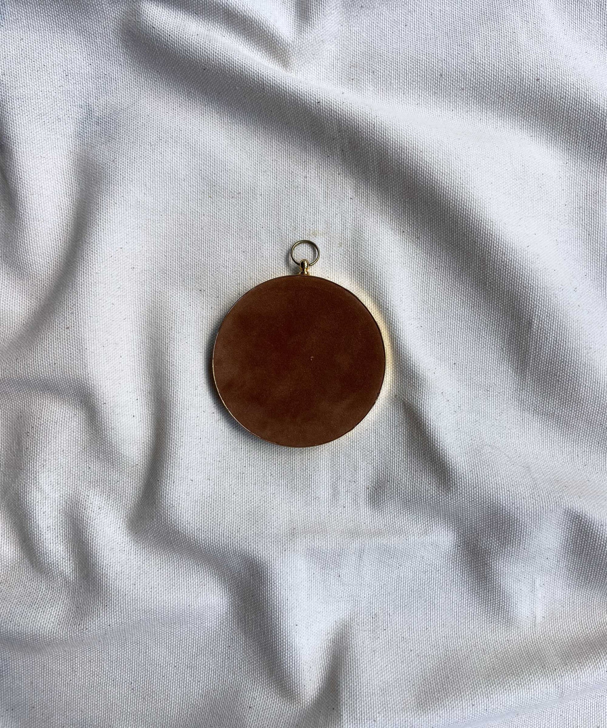 A signed print of a bee by Catherine Bamber Art, framed in a miniature, second-hand, gold frame. Overall size w 75mm x h 75mm (+15mm for the hook). Ready to hang, no stand.
