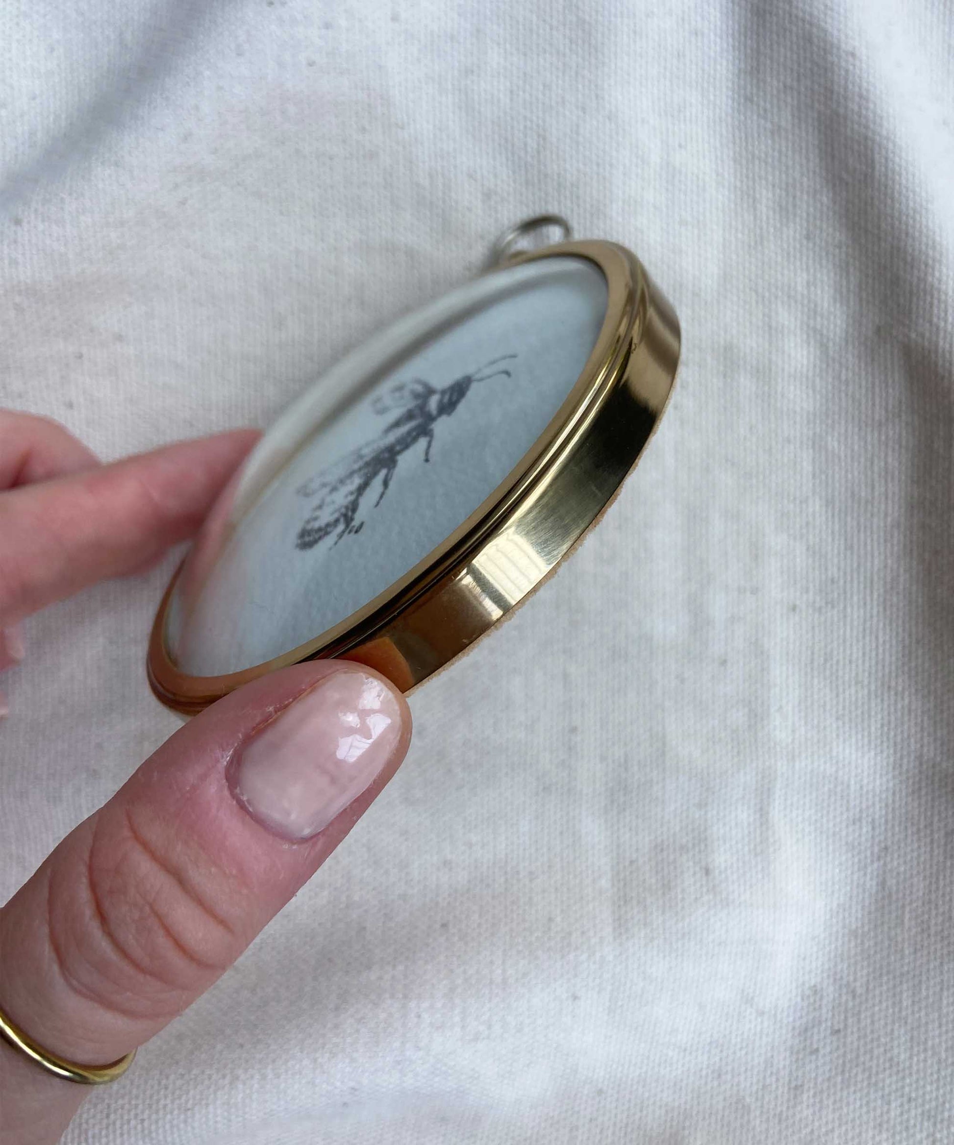 A signed print of a bee by Catherine Bamber Art, framed in a second-hand, gold frame. Overall size w 75mm x h 75mm (+15mm for the hook). Ready to hang, no stand. The glass is slightly domed.
