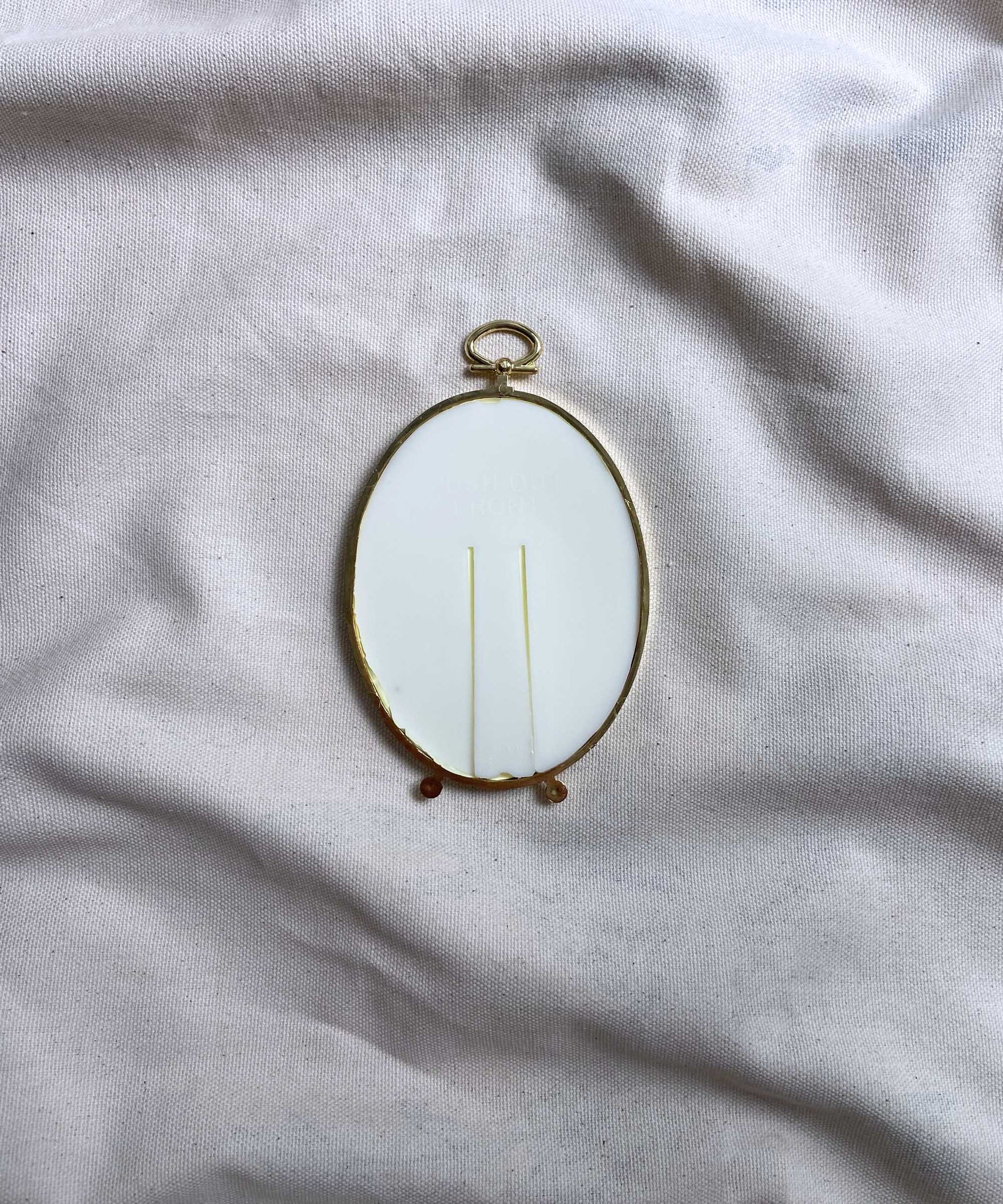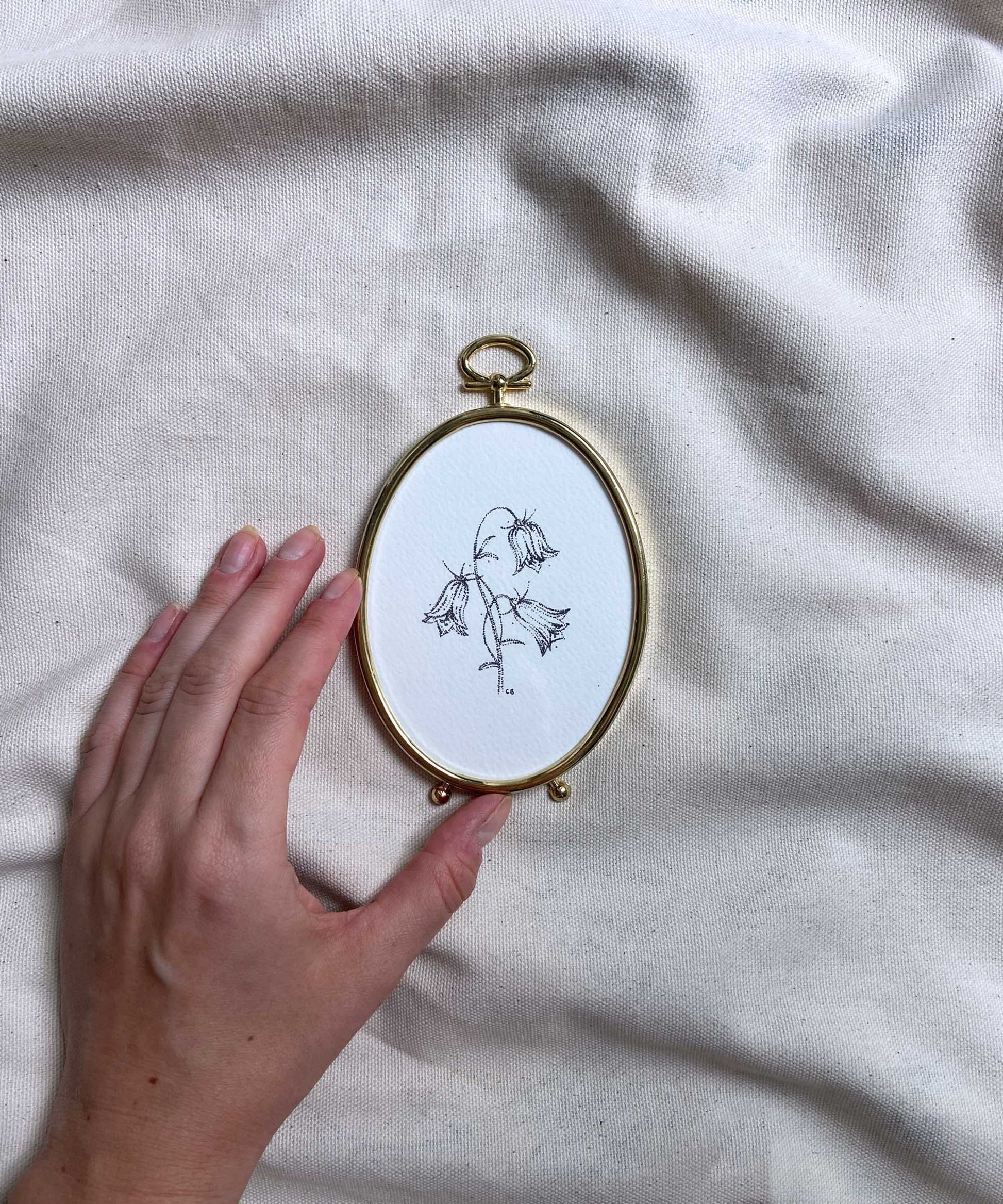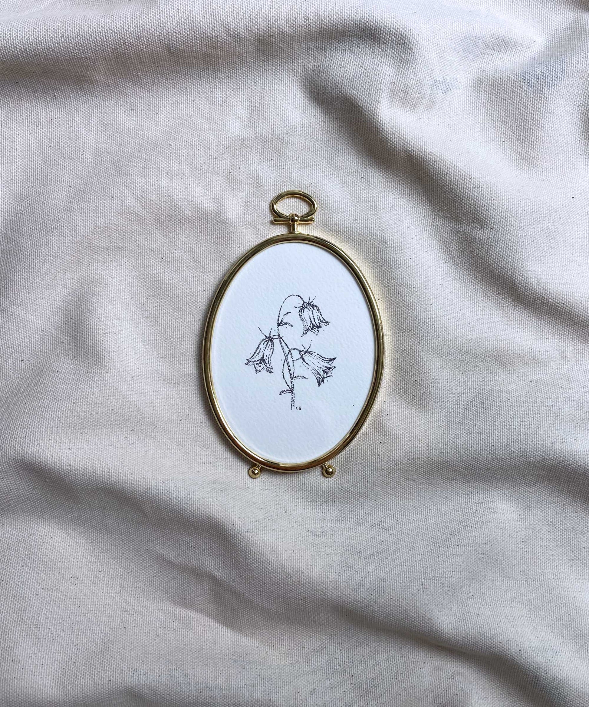 A signed print of bluebells by Catherine Bamber Art, framed in an oval, second-hand, plastic frame. Overall size w 85mm x h 135mm (including loop and legs). Ready to hang (loop on top) and stand on the back.