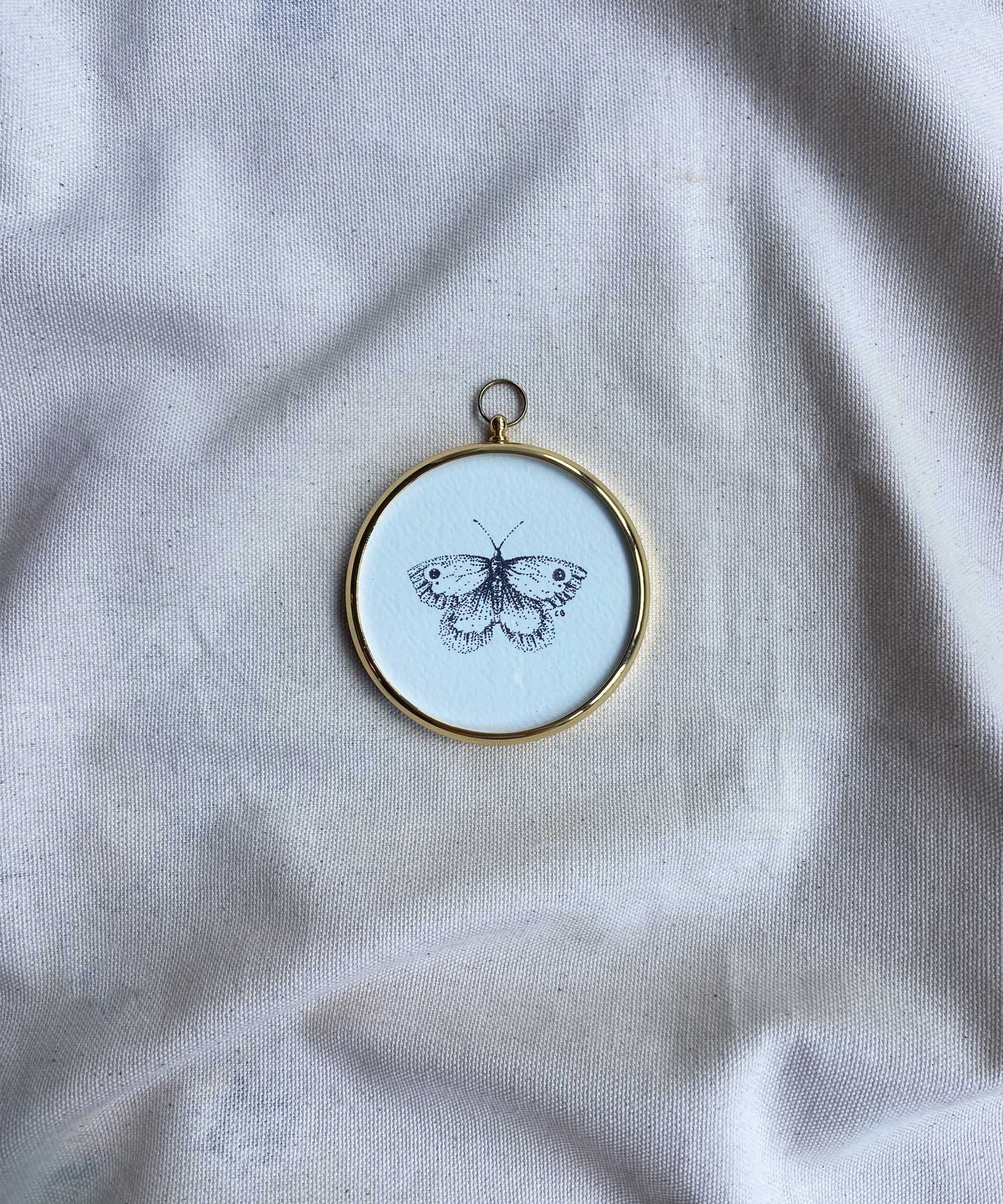 A signed print of a butterfly by Catherine Bamber Art, framed in a miniature second-hand gold frame. Overall size w 75mm x h 75mm (+15mm for the hook). Ready to hang, no stand.