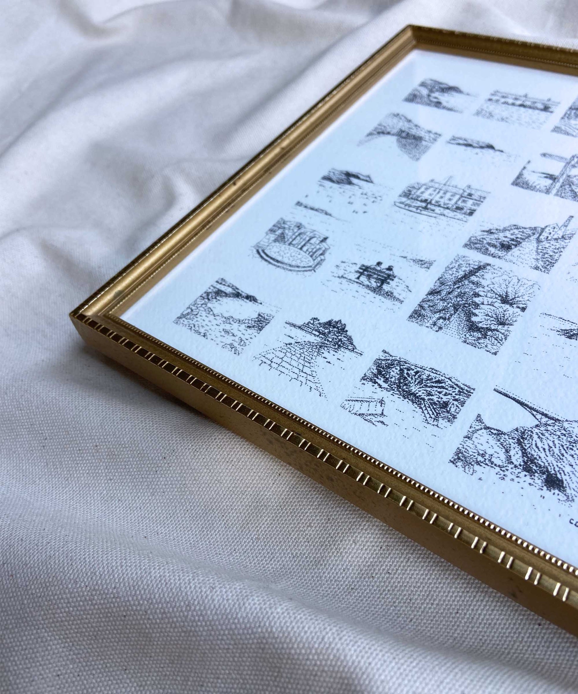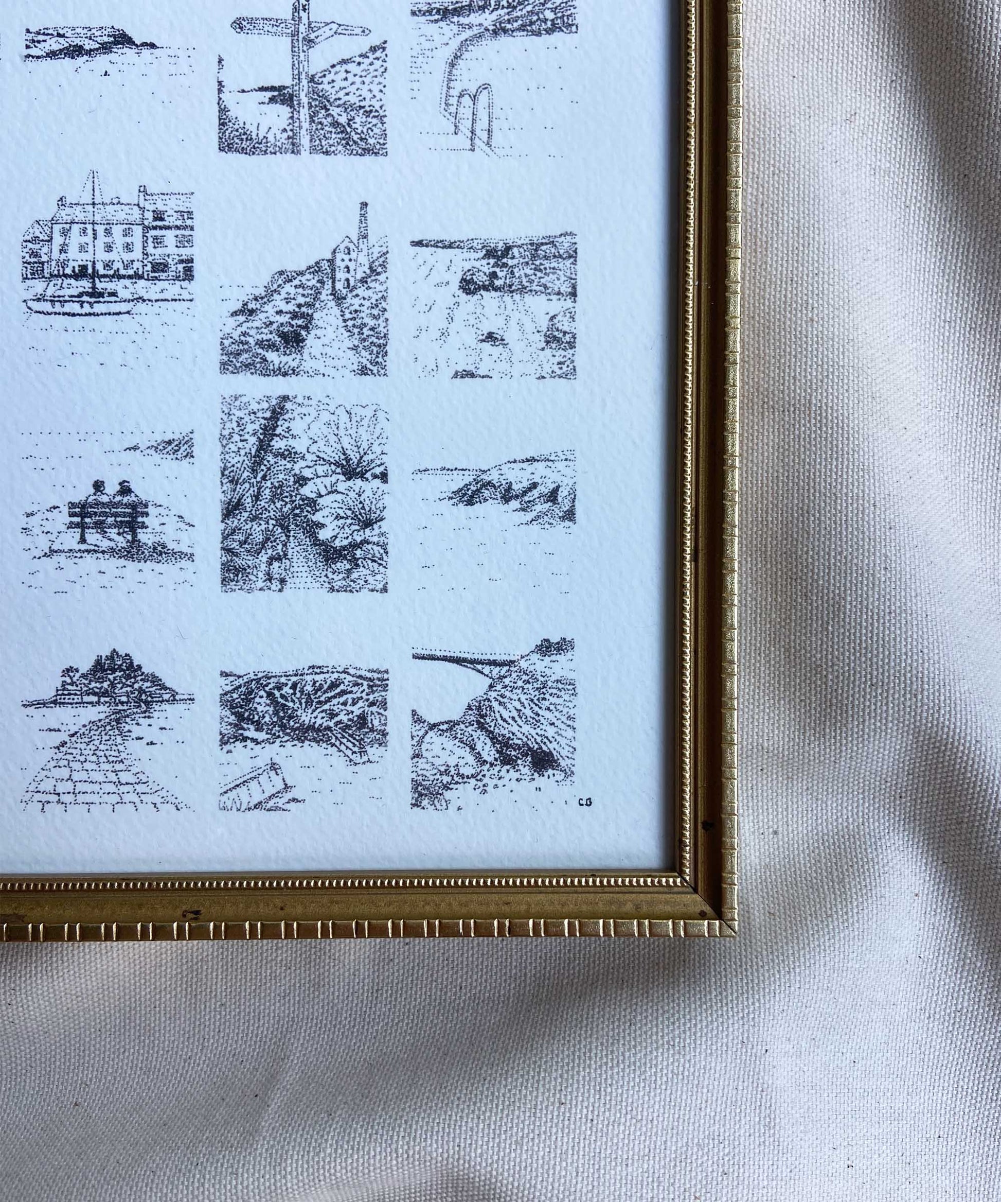 "Moments" is a collection of drawings capturing my favourite moments in an area, starting with Cornwall. A card is attached to the back of the frame with the location of each moment. This framed art print of 'Cornwall Moments' is a print of my original drawing, printed onto high-quality, 300 gsm textured paper. Each piece is drawn in my signature style of building up lots of small dots and framed in carefully curated vintage frames, blending the contemporary and traditional.