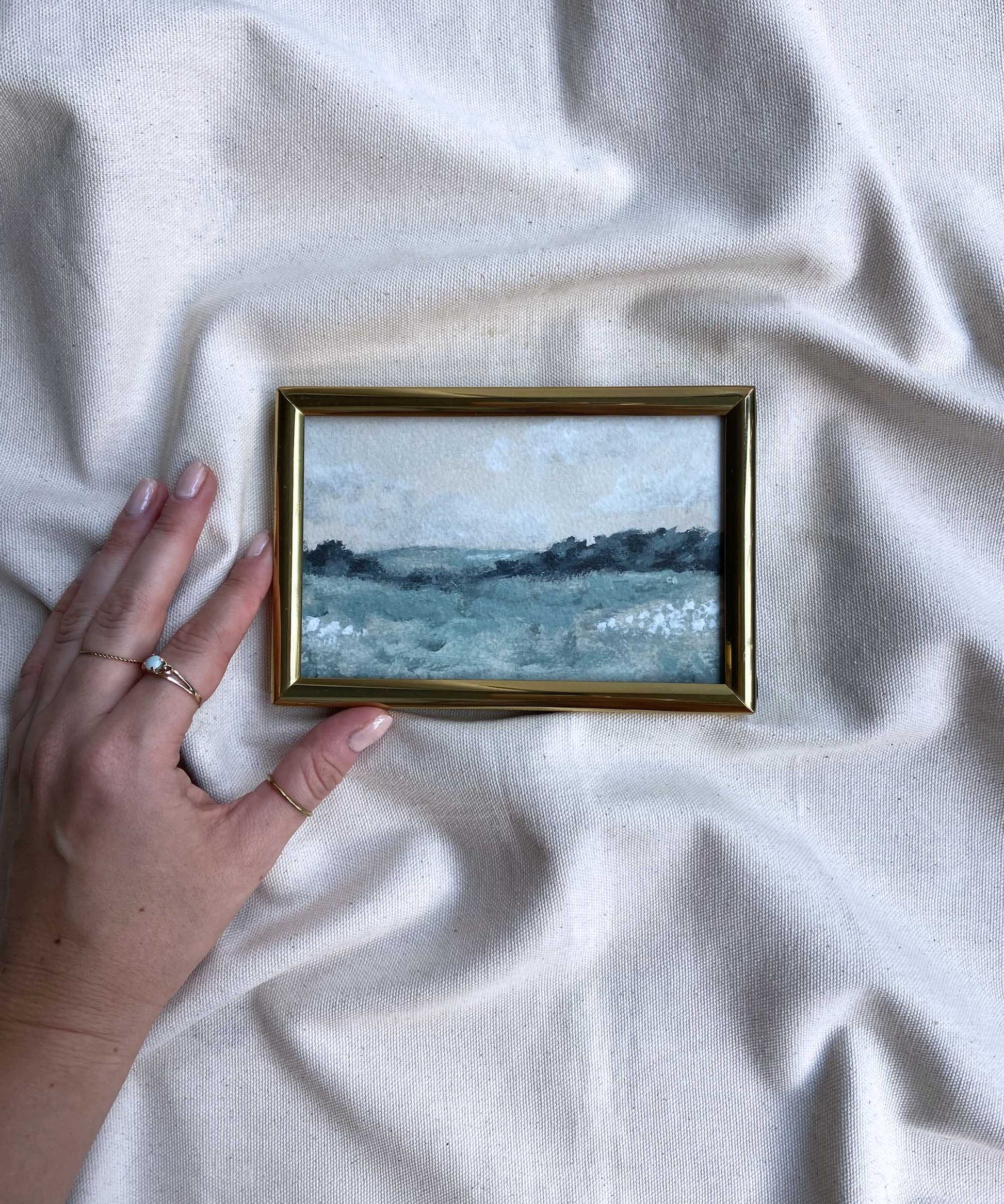 A signed print of the English countryside by Catherine Bamber Art, framed in a second-hand gold frame. Overall size w 155mm x h 105mm. Comes with a stand.
