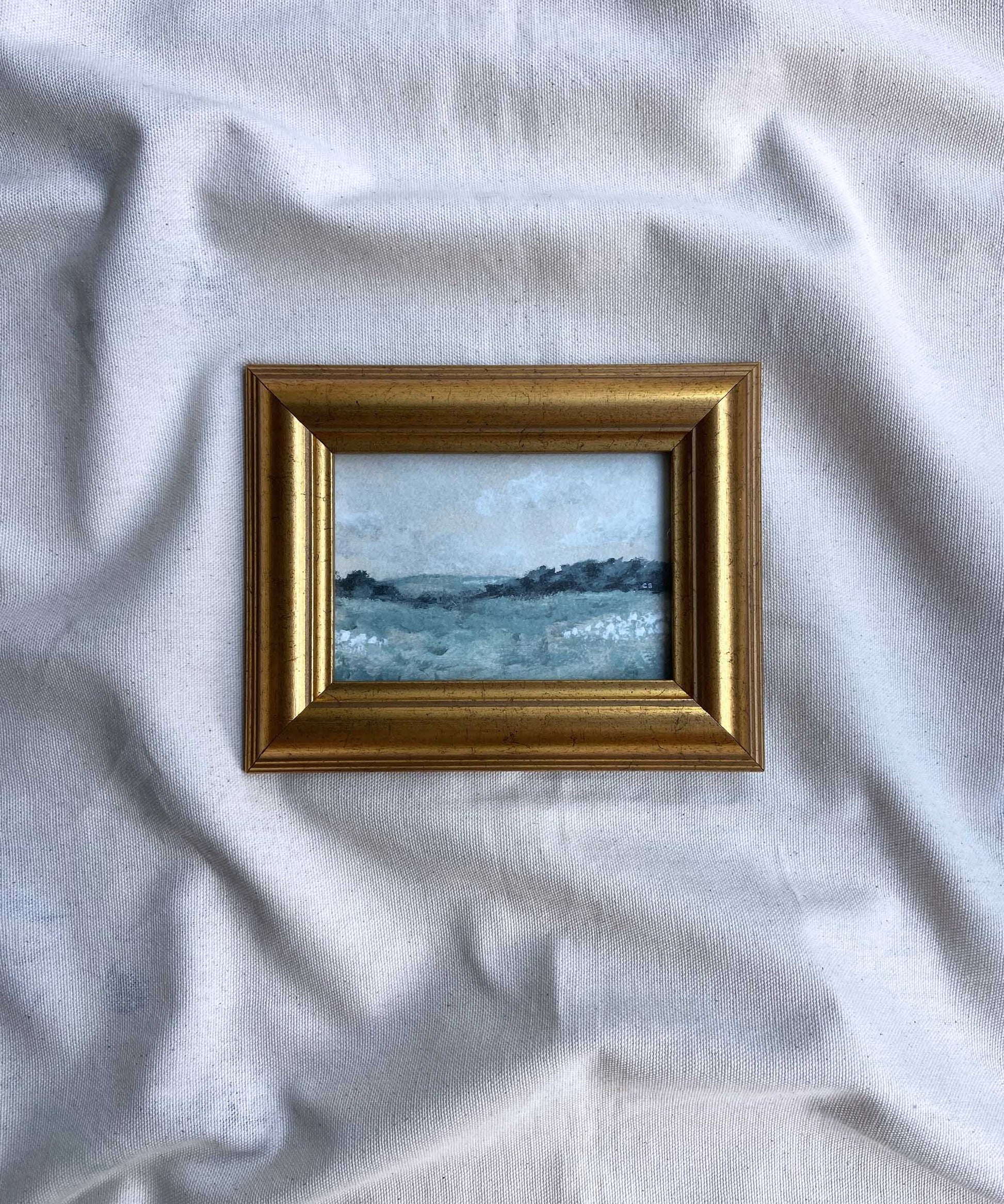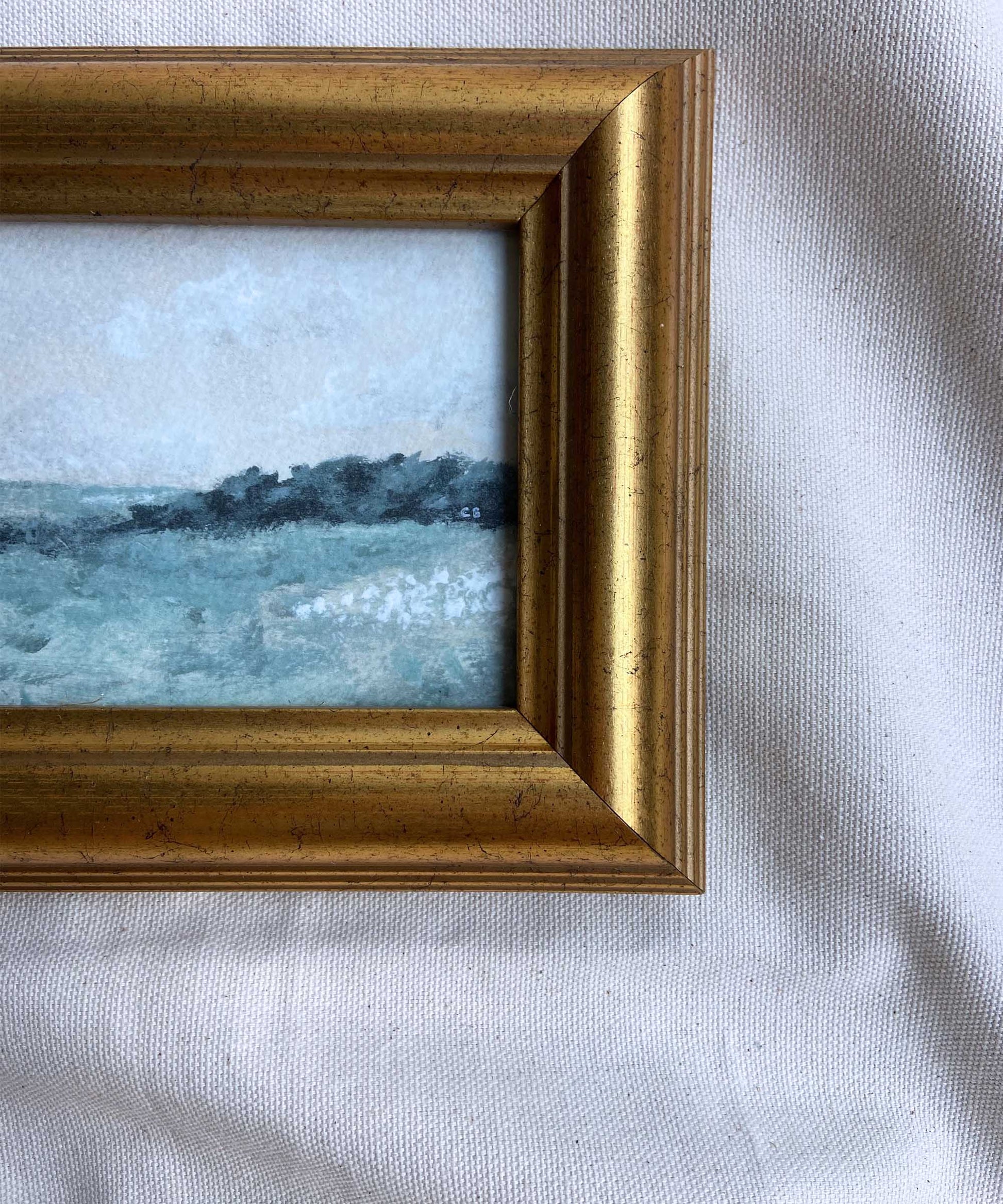 A signed print of the English countryside by Catherine Bamber Art, framed in a second-hand gold frame. Overall size w 182mm x h 145mm. Comes with a stand and is ready to hang.