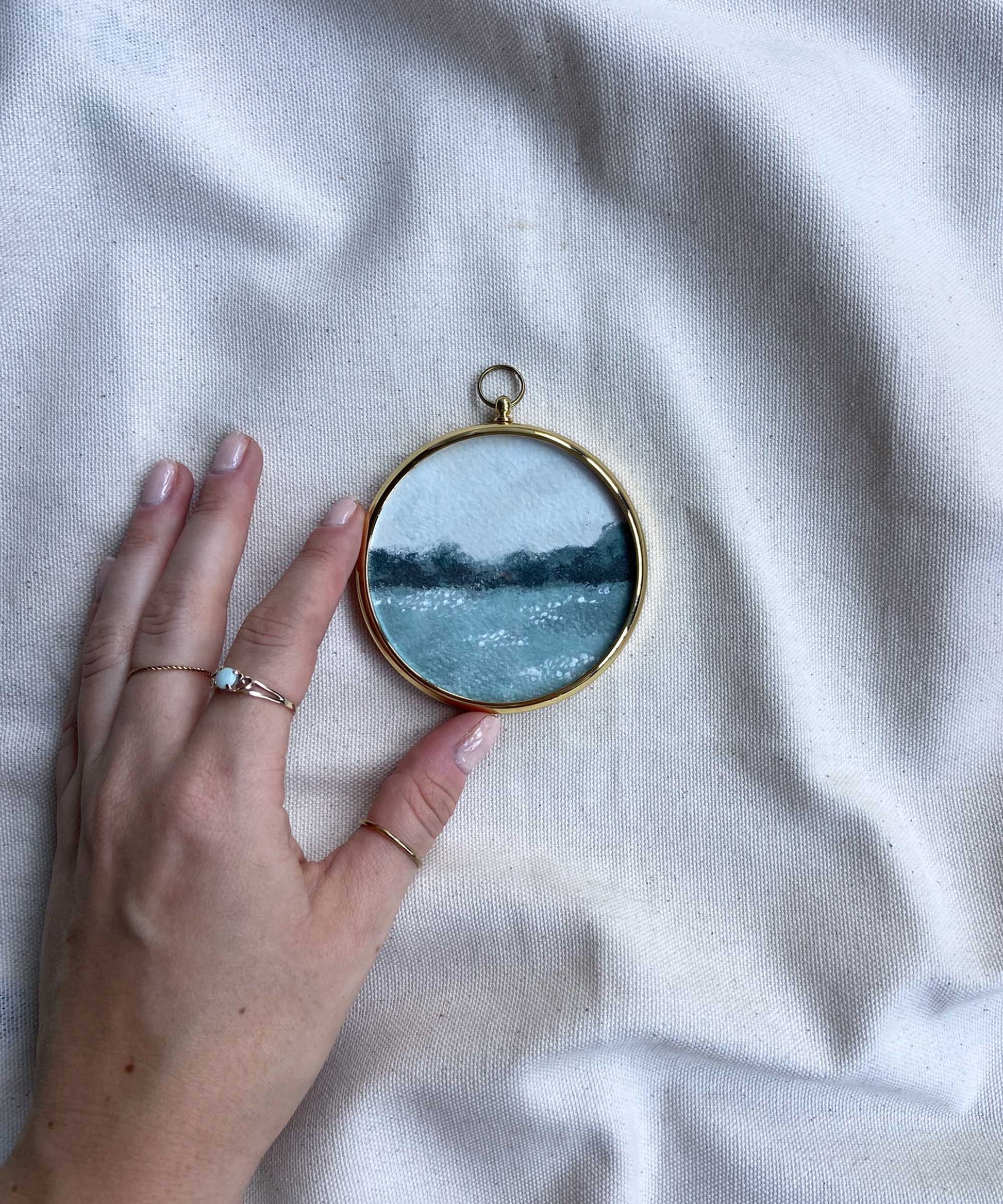 A signed print of the English countryside by Catherine Bamber Art, framed in a miniature, second-hand gold frame. Overall size w 75mm x h 75mm (+15mm for hook). Ready to hang, no stand.