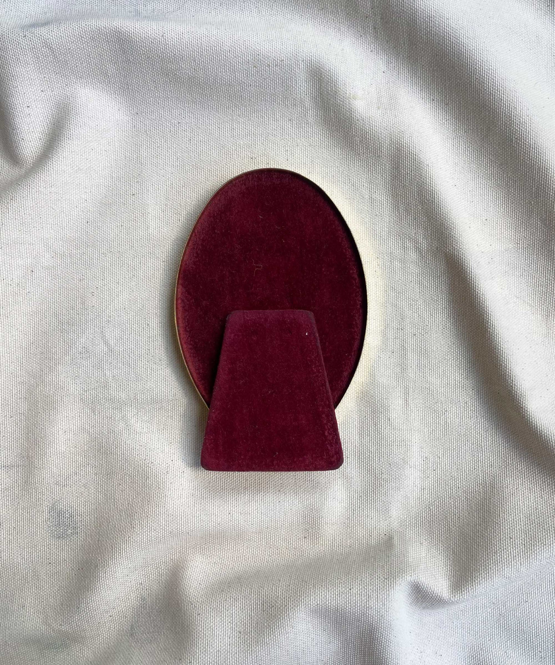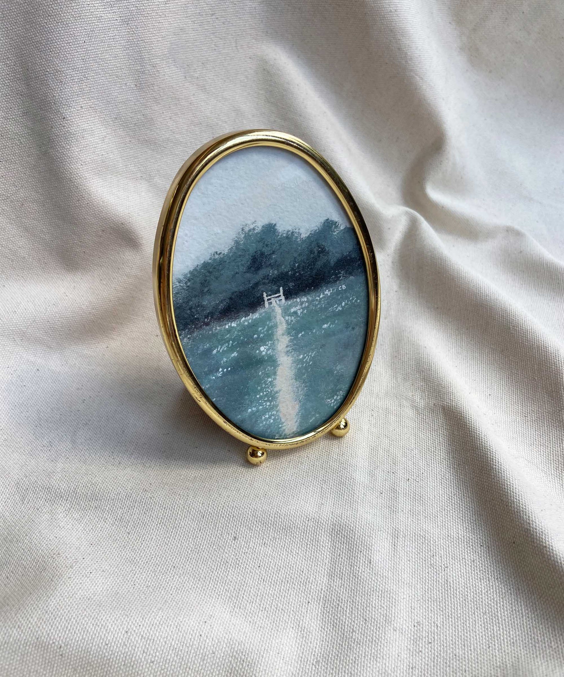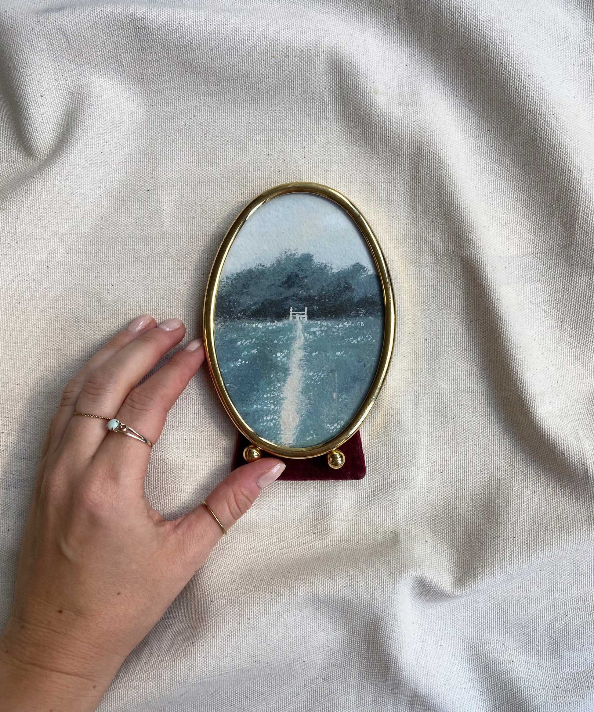 A signed print of the English countryside by Catherine Bamber Art, framed in a miniature, second-hand gold frame. Overall size w 90mm x h 135mm (including feet). Comes with a stand.