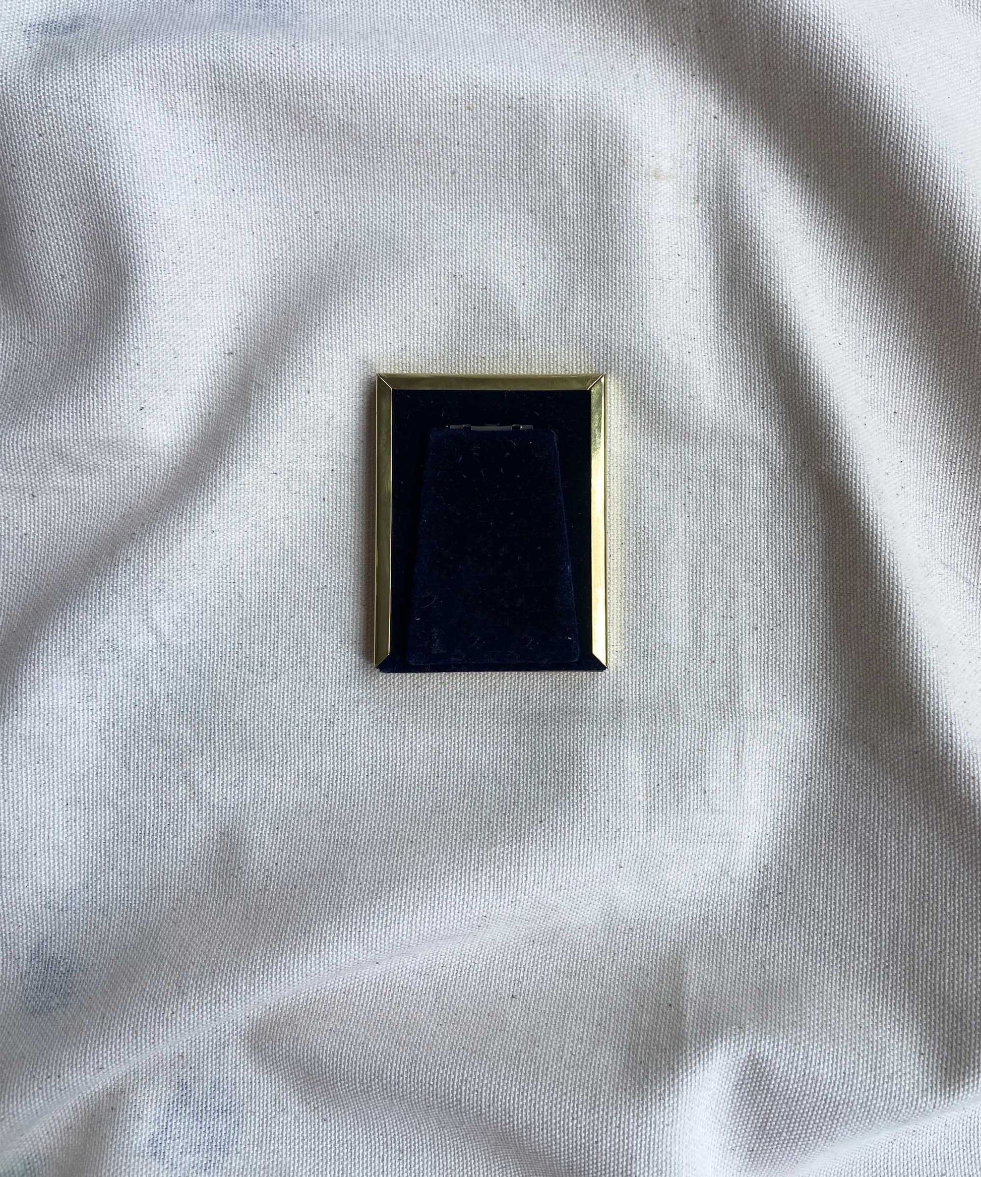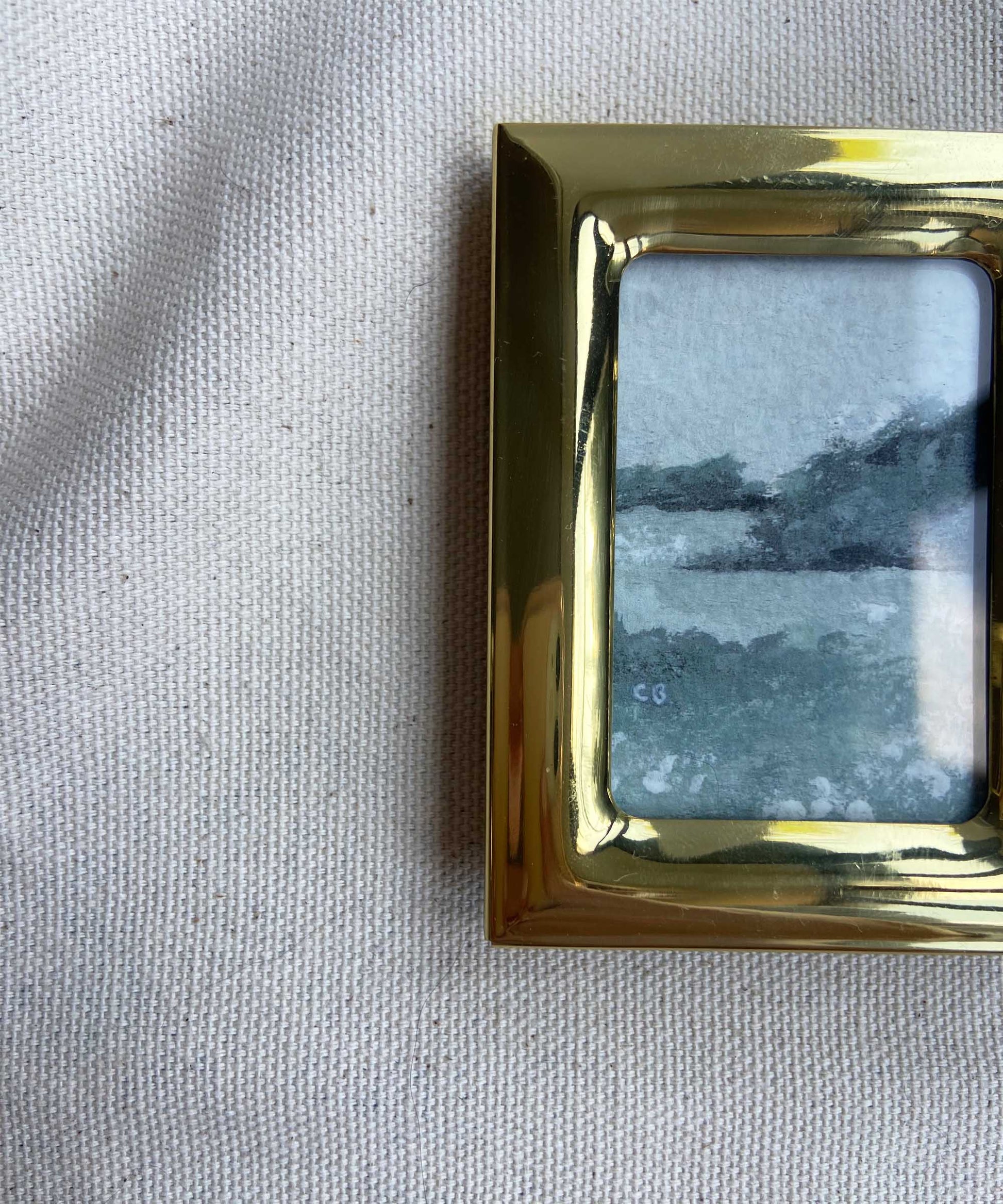 A signed print of the English countryside by Catherine Bamber Art, framed in a miniature, second-hand gold frame. Overall size w 56mm x h 75mm. Comes with a stand.