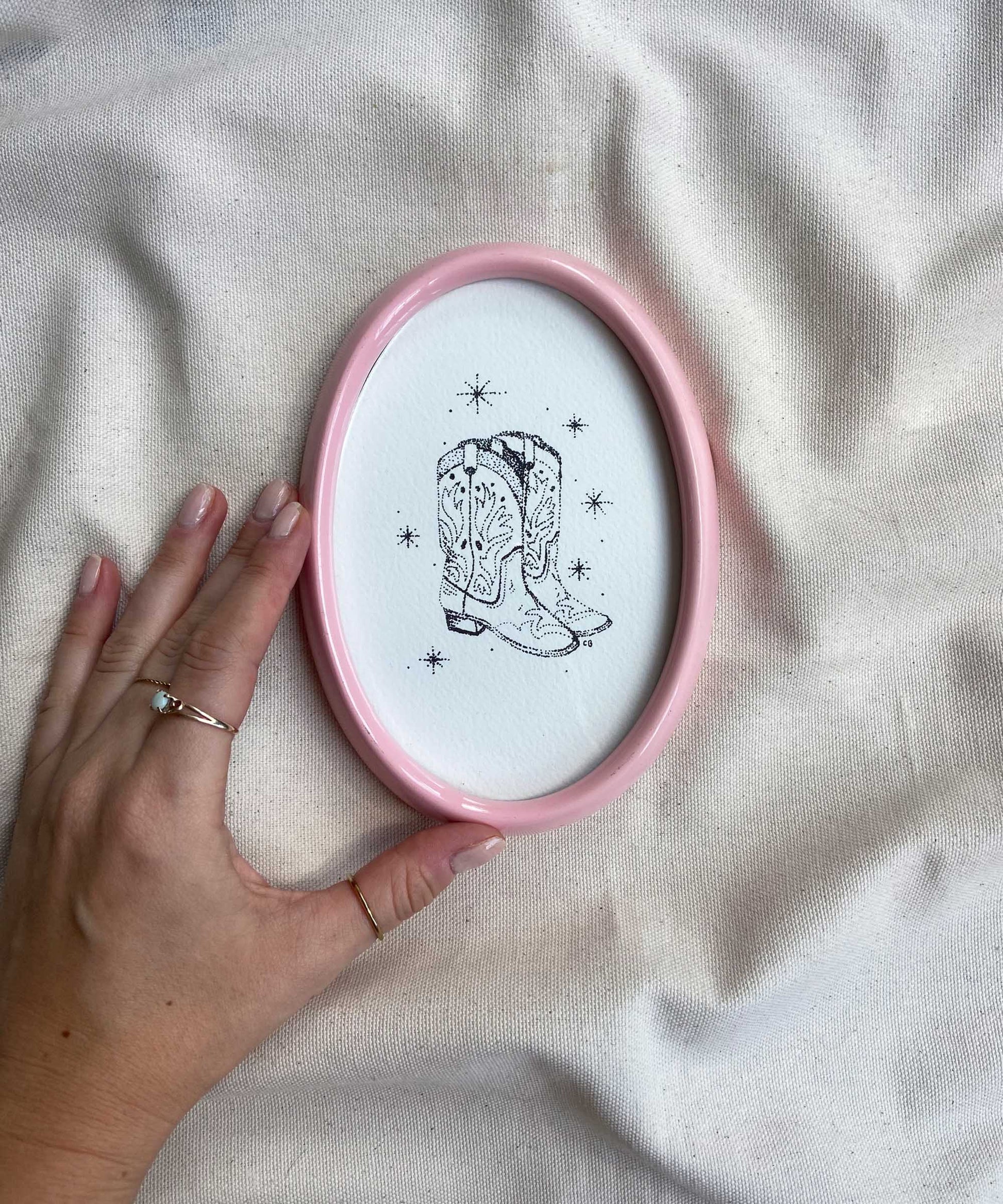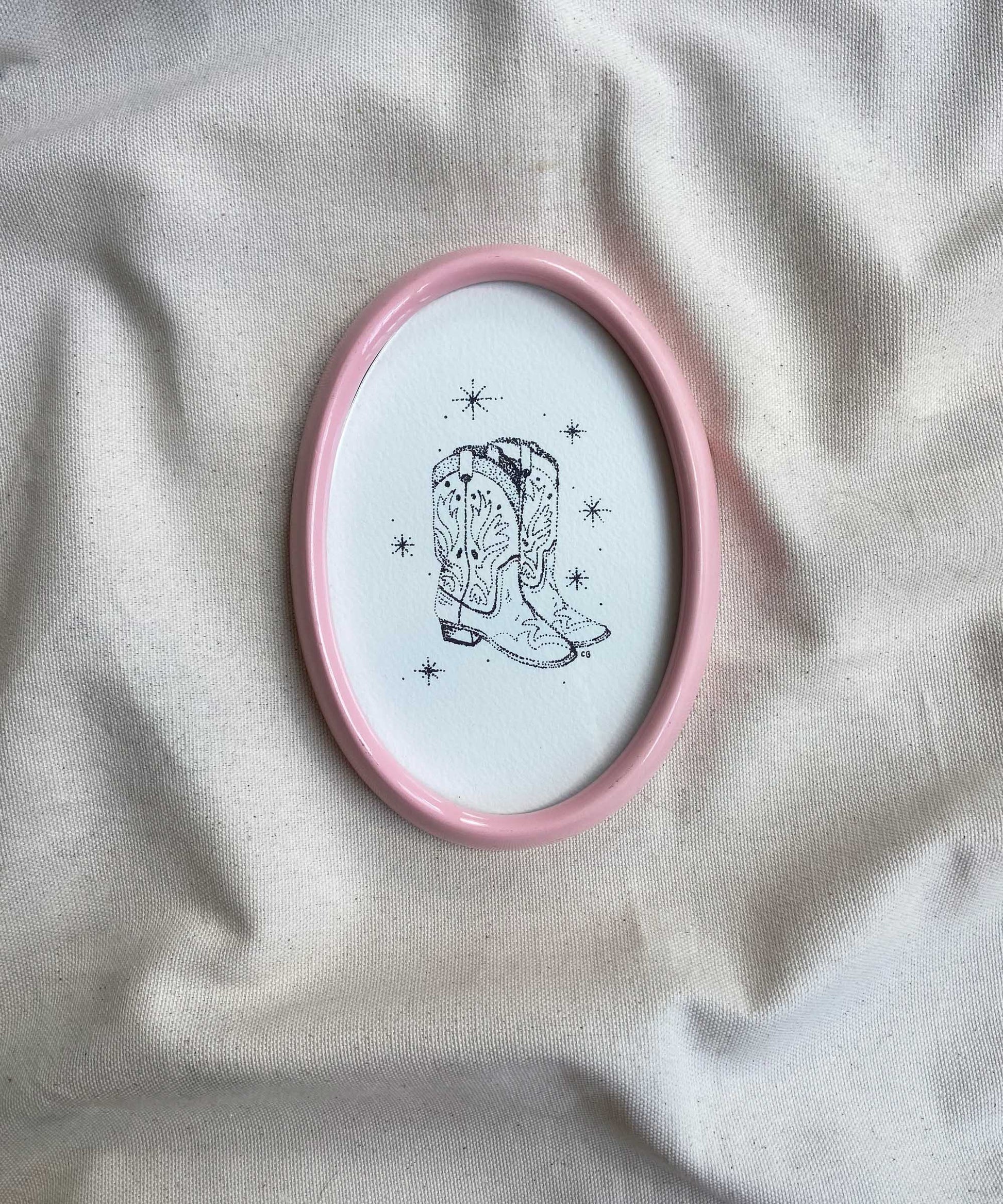 A signed print of cowboy boots by Catherine Bamber Art, framed in a second-hand, pink frame. Overall size w 120mm x h 167mm. Ready to hang, no stand.